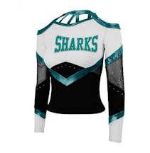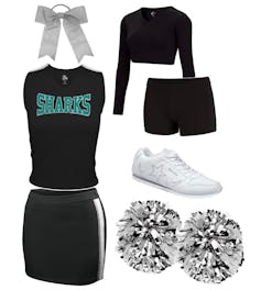 (New Cheerleaders: Sharks Cheer Uniform with crop top and boy cut briefs, 2 Practice Shirts, Warm-ups, shoes, pom poms, cheer bow, Welcome Party)